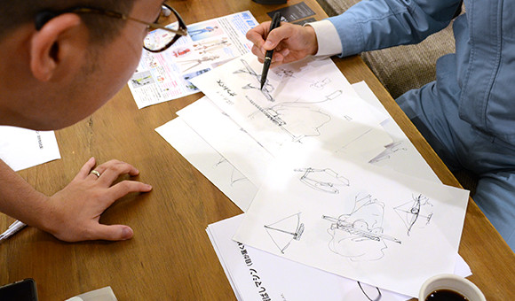 明和電機社長、土佐信道社長が株式会社人間に来訪。早速、人間の山根より、コラボ作品案を数種類提案。